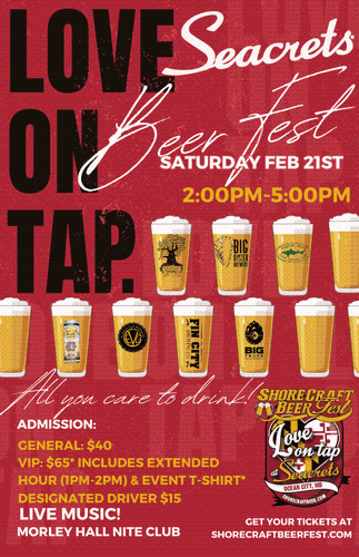 Calling all craft beer lovers! Get ready for Love on Tap, the ultimate brewfest experience! Immerse yourself in the world of local craft breweries, where you'll enjoy unlimited tastings of their finest creations. We have added Ready to Drink cocktails (RTDs), Hard Seltzer, Hard Tea, a signature Seacrets Distilling cocktail, Mocktails and more for those who prefer options other than craft beer.