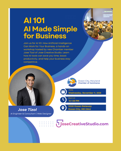 Join us for AI 101: How Artificial Intelligence Can Work for Your Business, a hands-on workshop hosted by new Chamber member Jose Tizol of Jose Creative Studio. Artificial Intelligence isn't just for big tech companies; it's a practical tool that can help local businesses thrive. In this workshop, you'll discover how AI can free up your time, improve customer engagement, and make your day-to-day work easier.